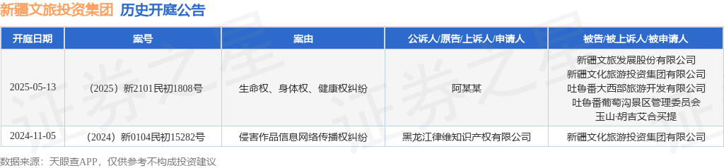 案号:(2025)新2101民初1808号审理法院:吐鲁番市高昌区人民法院案由:生命权、身体权、健康权纠纷当事人信息: 原告/上诉人:阿某某 被告/被上诉人:新疆文旅发展股份有限公司、新疆文化旅游投资集团有限公司、吐鲁番大西部旅游开发有限公司、吐鲁番葡萄沟景区管理委员会、玉山·胡吉艾合买提开庭日期:2025年5月13日根据统计,近一年内以新疆文化旅游投资集团有限公司为当事人的历史开庭公告有2则,其中案由为“侵害作品信息网络传播权纠纷”的公告以1则居首,其次为“生命权、身体权、健康权纠纷”有1则。历史开庭公告如下: